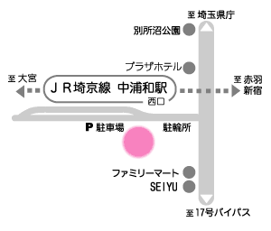 JR埼京線(快速・各駅停車)で「中浦和」駅下車 ●JR埼京線への乗り継ぎ路線 ・京浜東北線・宇都宮線・高崎線・湘南新宿ライン・上野東京ライン →赤羽駅・大宮駅から ・新幹線(東北・上越・北陸)・東武野田線・ニューシャトル →大宮駅から ・武蔵野線 →武蔵浦和駅から ・山手線・西武池袋線・東武東上線・有楽町線・副都心線 →池袋駅から ・中央線・総武線・京王線・小田急線・都営新宿線・大江戸線 →新宿駅から ・丸ノ内線 →池袋駅・新宿駅から ・東急東横線・田園都市線・京王井の頭線・銀座線・半蔵門線 →渋谷駅から ・川越線 →直通または大宮乗り換え ・りんかい線・相鉄線 →直通または新宿乗り換え |