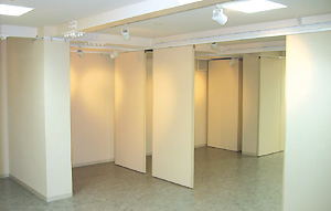 - 2面ある仕切りパネルの使用で、部屋の広さが3段階選べます。 また、空間・床面・壁面のスペース調整ができ、小品展から多数展示や大作展まで幅広く開催できます。