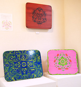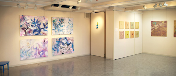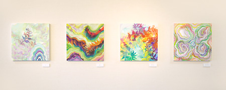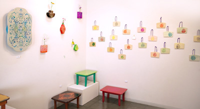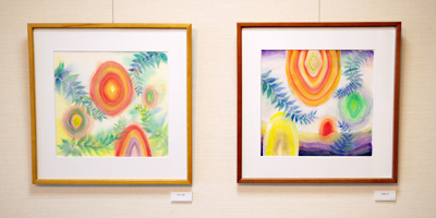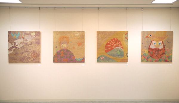 | 色紙・和紙を素材に貼り絵や、キラキラした粉をメディウムに混ぜた絵具を用いて身近な生活用品や動物、気になった言葉や音を表現する浅野純人と、平面・木工作品を通じて身近にある植物などをモチーフに、時間、感情をはらみ移ろいながら出来てくる形、空間を表現する古内忠輔の2人展です。